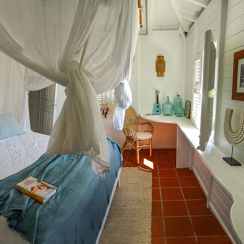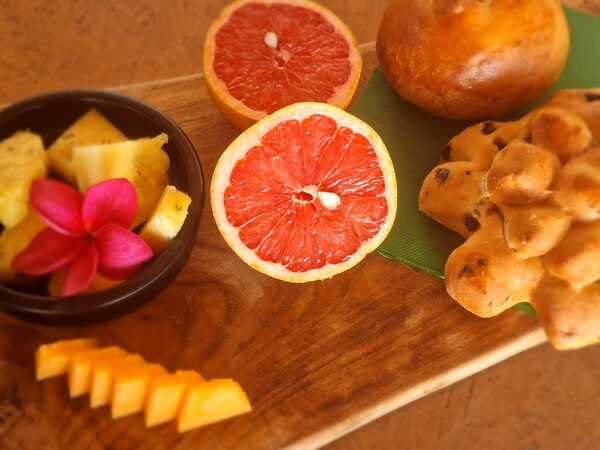 Tartare de fruits frais, jus de fruits frais (25cl), rocher coco ganache chocolat, madeleine chocolat blanc citron, crêpes à la farine de manioc, pommes cannelles (brioches locales), pain maison, beurre doux et beurre salé, confitures locales.